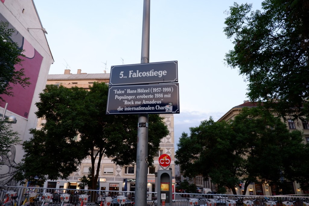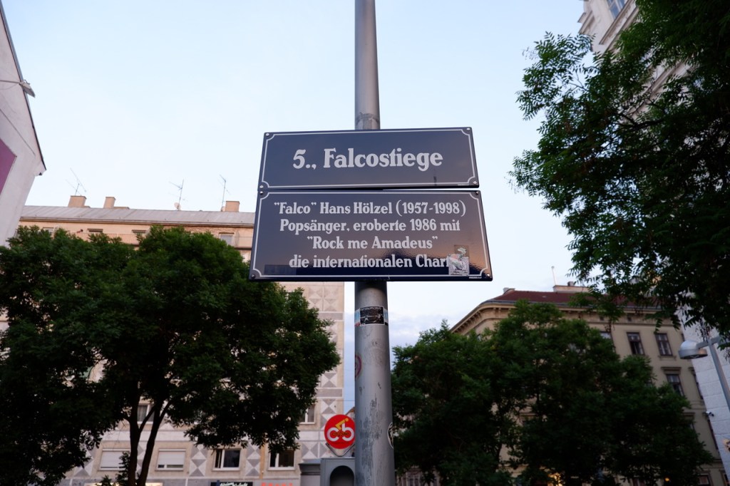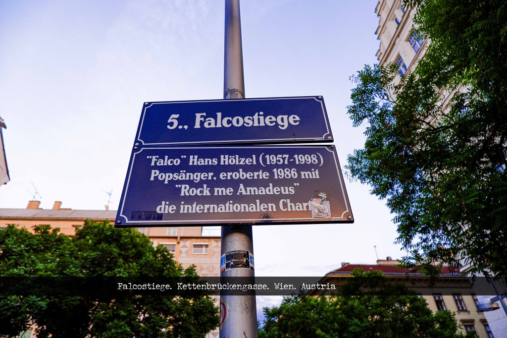Na szyldzie widnieje napis: „5. Falcostiege. „Falco” Hans Hölzel (1957-1998). Popsänger, eroberte 1986 mit „Rock me Amadeus” die internationalen Charts”